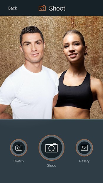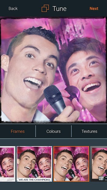 Choose one of the 68 different poses of Ronaldo, shoot a selfie with him, adjust the photo, apply frames,
