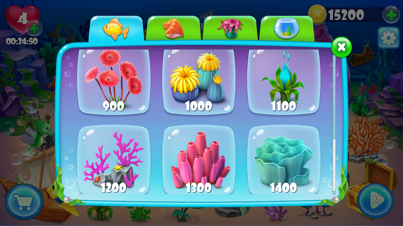 Your task is to develop and decorate the aquarium for points that you can earn by playing "three in a row." The more coins you have, the more beautifully you will be able to decorate your aquarium and fill with different living creatures.