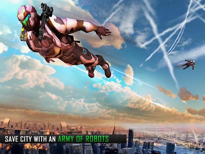 Flying Robot Grand City Rescue has amazing robot controls that extremely increases the fun, excitement of action packed gameplay. Exciting role as futuristic flying robot super steel hero job will let you exhibit your super robot flying skills to rescue and fight. Fly over the grand city to the ultimate height for searching and rescuing people in emergency situation and take them to ambulance. Give a hard time to criminals escaping from the grand city jail combating police officers. Snipe Shoot them away with your advanced robotic steel gun and robot missile in action simulator. Be the futuristic warrior steel robot and fight bravely with the criminals to save the city and dismiss mafia groups causing terror in the city town. Enjoy the real thrill in criminal chase missions and be the super robot steel warrior legend in action simulator.