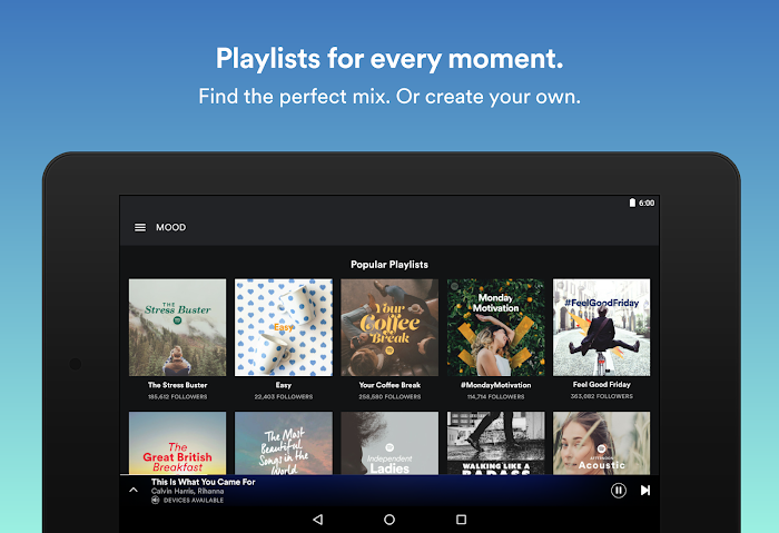• Find music, play songs and music albums from one of Spotify’s exclusive curated playlists for any music genre or popular artist