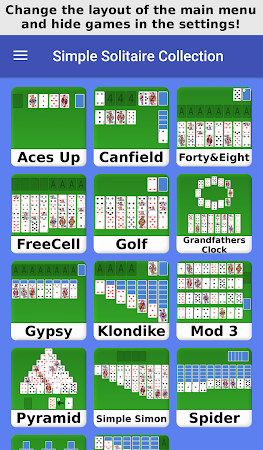 Currently you can play AcesUp, Canfield, Forty&Eight, FreeCell, Golf, Grandfathers Clock, Gypsy, Klondike, Mod3, Pyramid, SimpleSimon, Spider, Tripeaks and Yukon. If you want me to add more games, please tell me.
