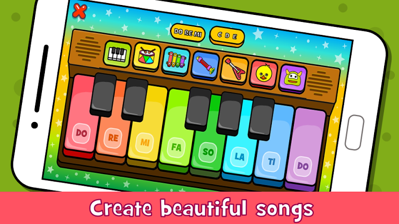 This mode teaches you with a guide the sequence of notes that you must play for each song. Learning music was never so easy and fun !!!