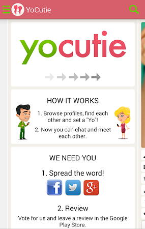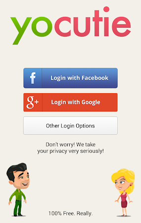 We stand behind our name. YoCutie is all about dating, flirting, chatting and finding your new dream partner. The good about it is that you get only in touch with people that your really interested in. This way you will never get a message from somebody who you don't like. We support Facebook, Google+ and E-Mail Login.