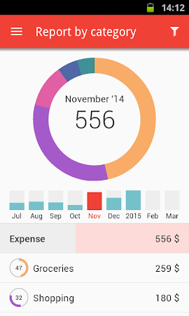 — Analyze your earnings and expenses through the specification of your transactions. The system of context-dependent reports will help you always stay within the green zone.