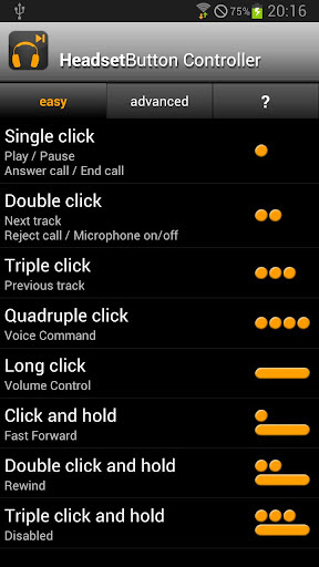 Once you have configured Headset Button Controller with your preferences, it runs in the background using almost no CPU. It is shipped with a default configuration profile, but you can change almost every action performed. It has been tested with a wide variety of different Android devices and music apps and works with both single-button headsets, and Android-specific 3-button headsets.